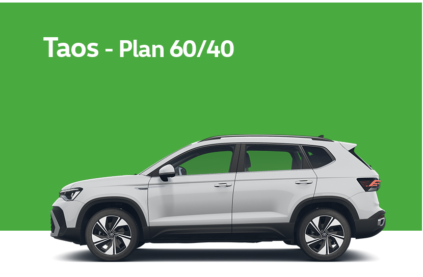 Imágenes no contractuales. Modelo de suscripción Taos Comfortline 250 TSI AT. Origen Argentina. Plan de ahorro previo por grupo cerrado aprobado por Resoluciones Nros. 804/98 y 788/04 de la Inspección General de Justicia de la Nación. Adjudica por sorteo y licitación. Plan 60/40. Plazo: 84 meses en cuotas calculables según precio del automotor. Los importes de las cuotas incluyen alícuota, cargos administrativos, seguro de vida, diferimiento y recupero de alícuota, impuestos, y derecho de admisión (prorrateado entre las cuotas 1 y la 12). No incluyen impuesto de sellos, patentamiento, prenda ni seguro del bien. Al retirar el vehículo se abonarán gastos de acuerdo a lo establecido en la Resolución Nro. 8/15 de la Inspección General de Justicia de la Nación. Administra Volkswagen S.A. de Ahorro para Fines Determinados. Domicilio legal: Maipú N° 267, Piso 13, CABA. Domicilio comercial: Av. De las Industrias No. 3101, General Pacheco, Pcia. de Buenos Aires.